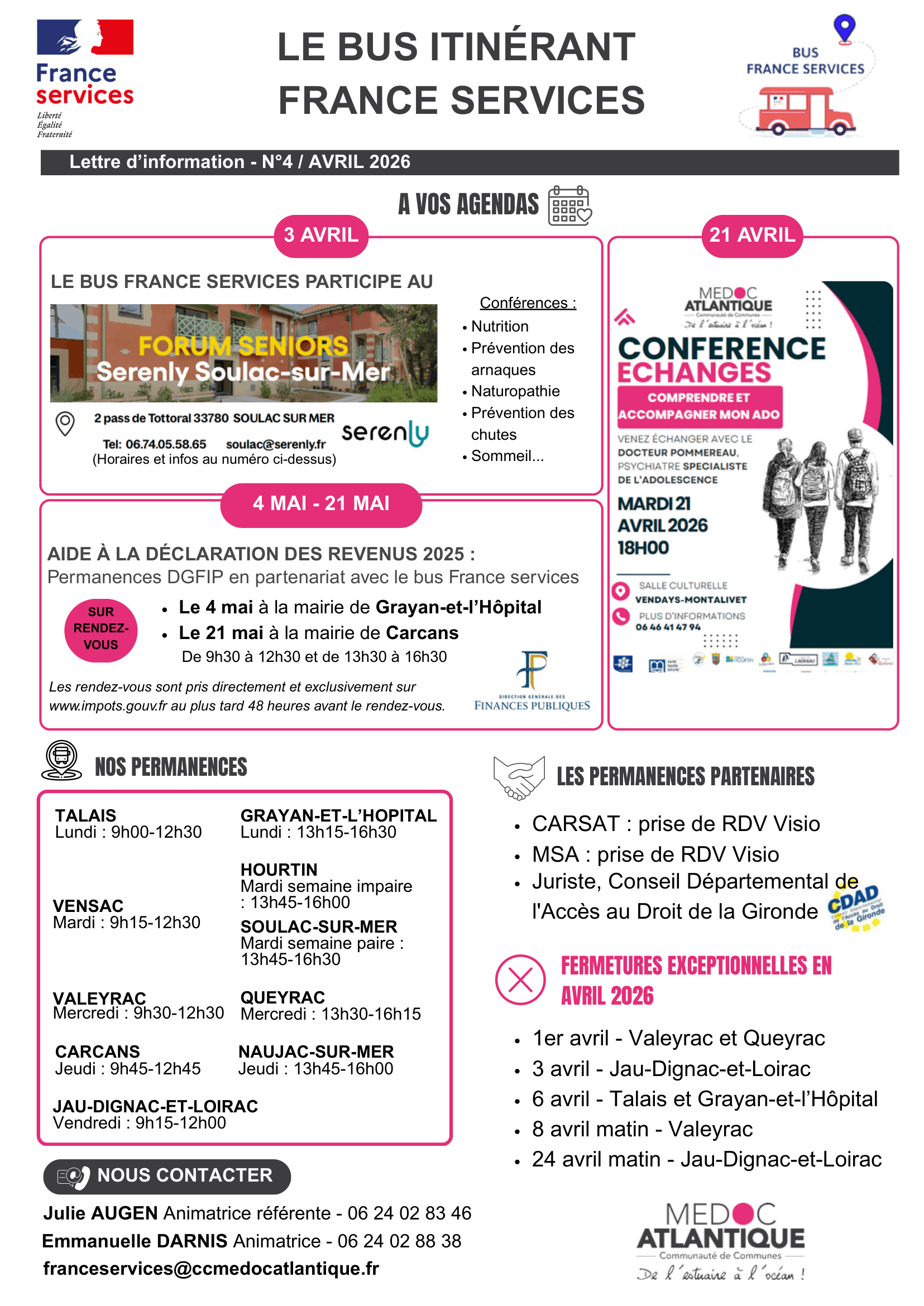 Le bus France services va parcourir les communes de la CDC Médoc Atlantique pour venir aux plus près des habitants afin de les aider dans leurs démarches administratives.